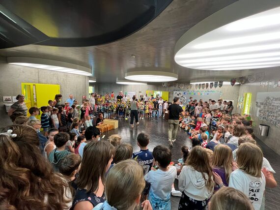 Nur noch drei Wochen sind die Kinder der 6. Klasse in der Primarschule. Beim letzten Schulhaussingen überraschten sie daher mit dem Lied Believer von Imagine Dragons die anderen Klassen. Vielen Dank für den sehr gelungenen Auftritt mit Singen und Musikinstrumenten!
