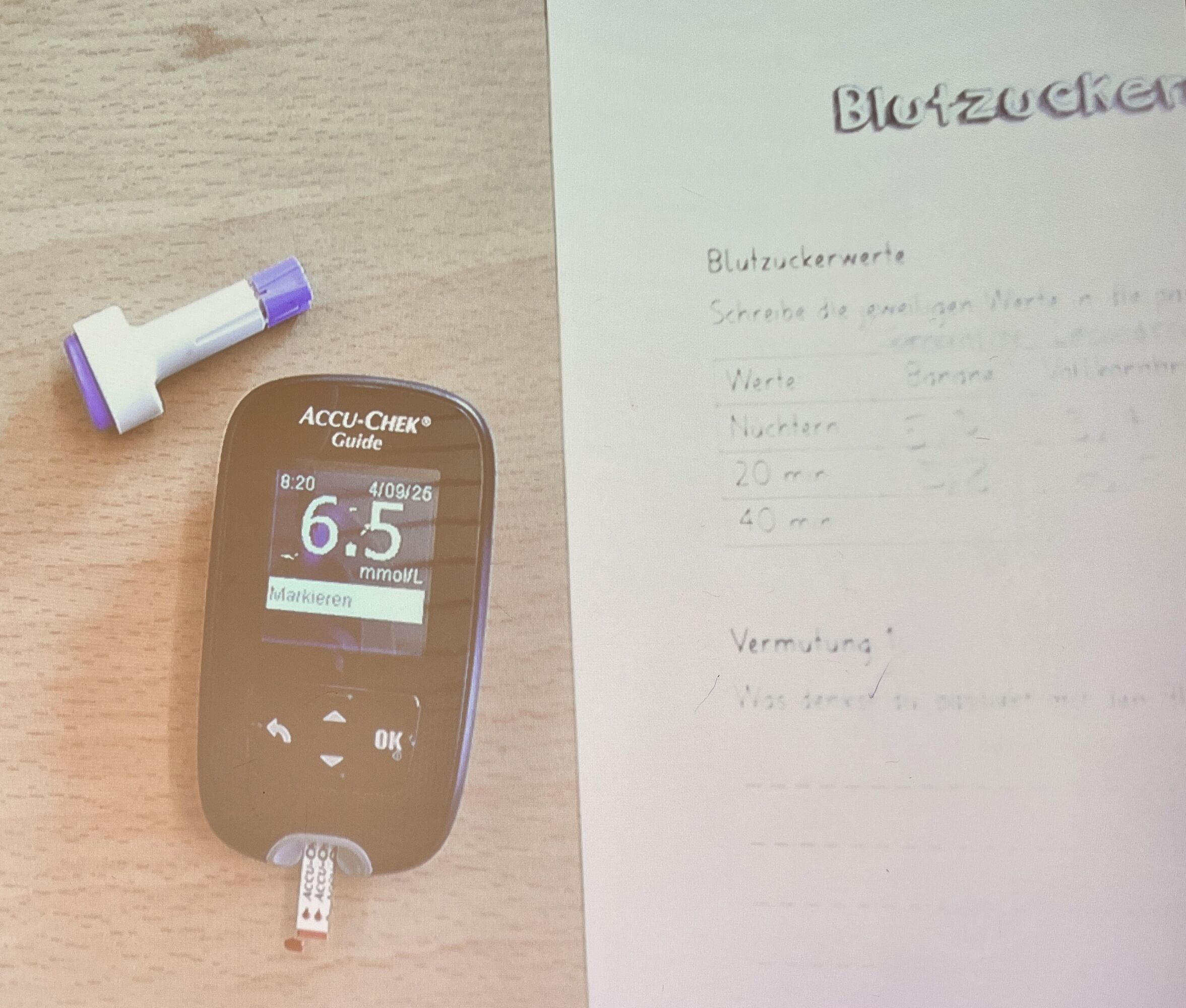 Die 5. Klasse hat unter professioneller Ausführung getestet, wie sich der Blutzuckerspiegel verändert, je nachdem was die Testpersonen essen. Die Testpersonen haben ihren Blutzuckerspiegel dreimal messen lassen, während die Klasse vermutet hat, wie sich die Messwerte wohl verändern würden. Der Versuch war spannend und hat gezeigt, dass Orangensaft oder Schoggimilch den Blutzuckerwert rasch ansteigen lassen. Beim Vollkornbrot oder der Banane dauert es länger, bis der Wert steigt, dafür bleibt die Energie auch länger.
