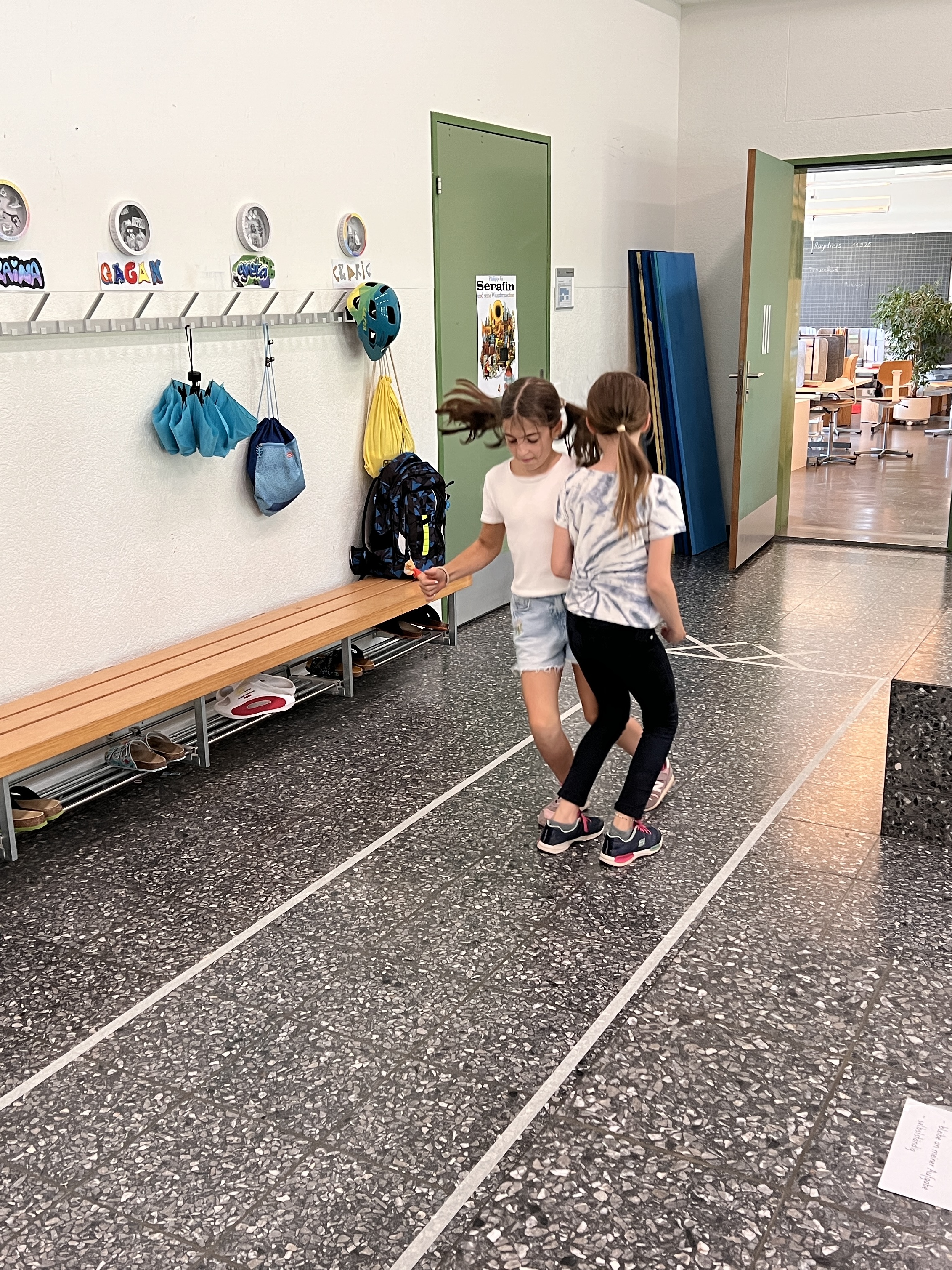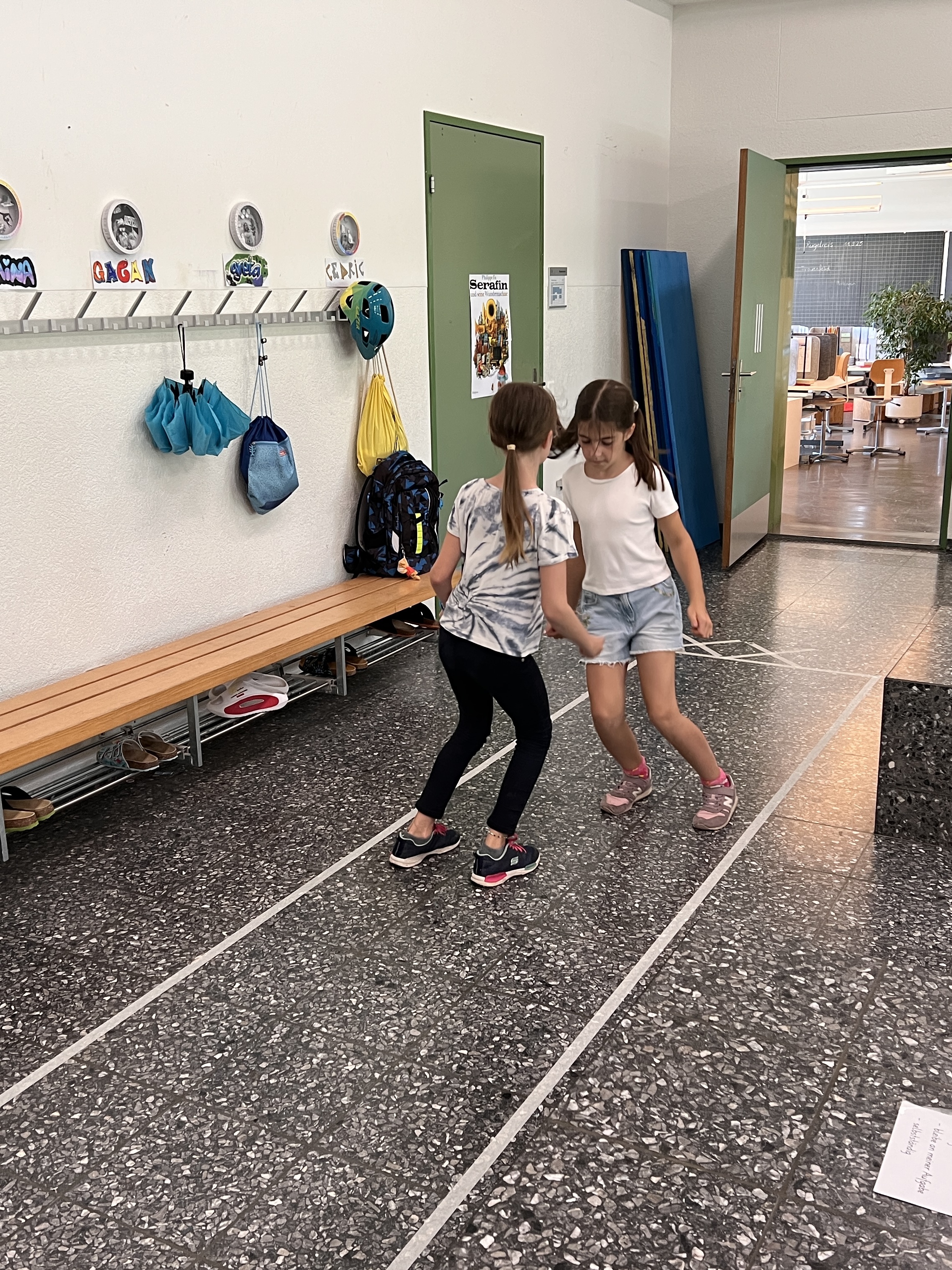 Die Klasse 4b übt einen Hüpftanz, bei welchem die Kinder von beiden Seiten gleichzeitig starten und immer die gleiche Schrittfolge machen. In der Mitte kreuzen sich die Kinder und können ohne Zusammenstoss aneinander vorbeispringen. Ziel ist es natürlich, dass die ganze Klasse gleichzeitig durch diesen Slalom hüpft, passend im Takt zur Musik.